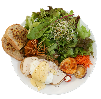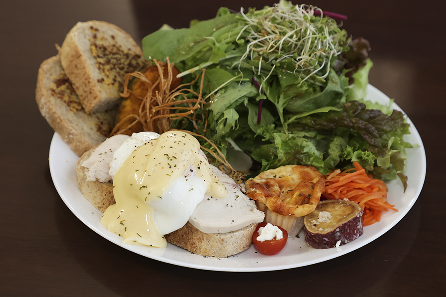 「まずは、ポーチドエッグを割って、あふれる黄身をサラダチキンやパンに絡めてお召し上がりください。パンの上に野菜とチキンを乗せたり、残ったソースをパンですくい取って食べたり、様々な組み合わせで最後まで飽きることなく味わえるのも魅力です」と、スタッフの佳子さんは話します。